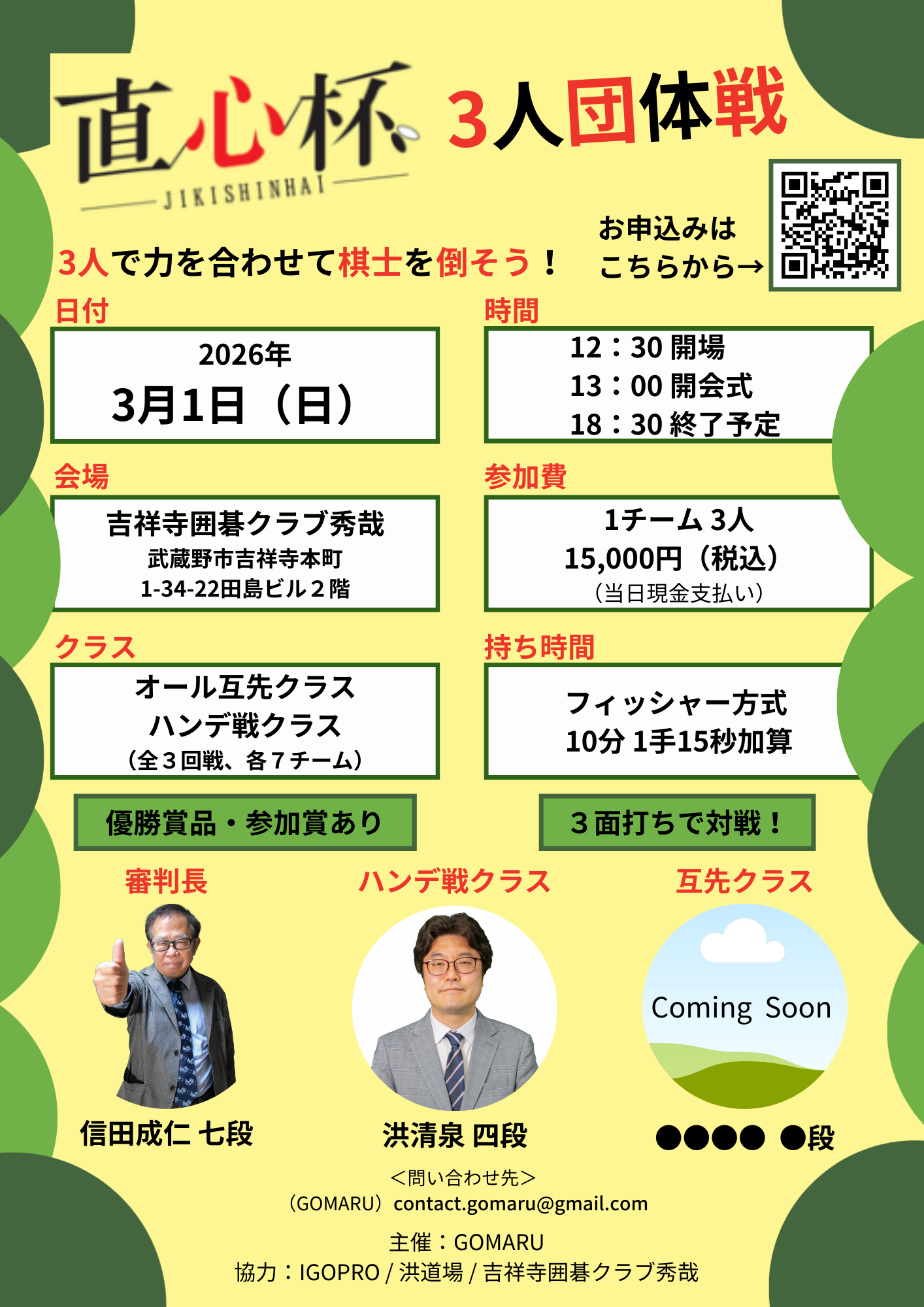 | 2026/03/01 | 直心杯 3人団体戦(3人で力を合わせて棋士を倒そう) | 級位,有段 | 吉祥寺囲碁クラブ秀哉 | |