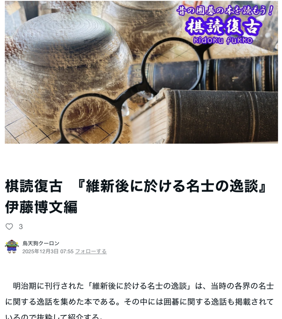 今回は、囲碁の歴史研究を軸に、アマ大会・イベント情報まで幅広く発信されている「烏天狗クーロン」さんのnoteをご紹介します。